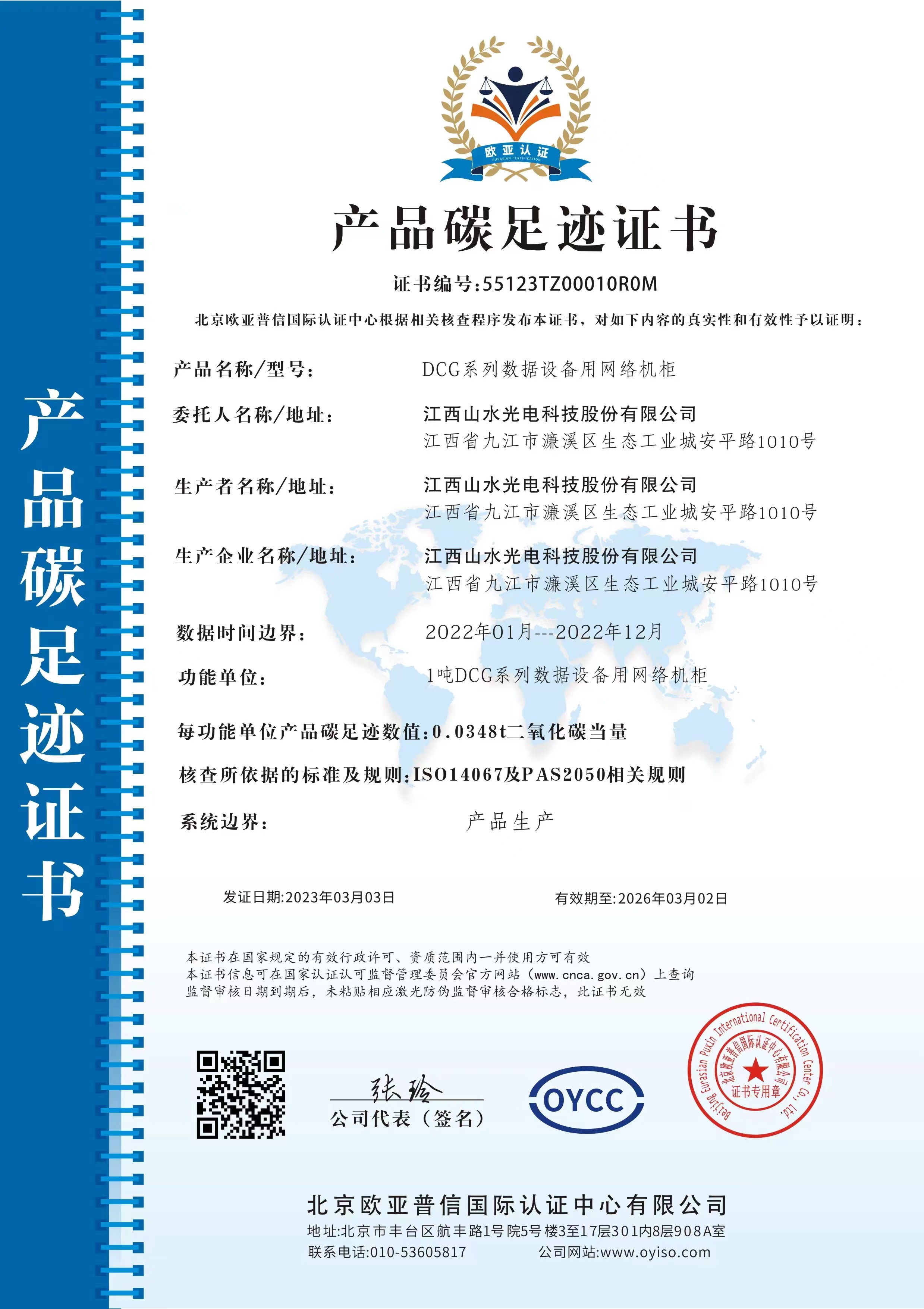 江西山水光電科技股份有限公司2022年度網(wǎng)絡機柜碳足跡已通過北京歐亞普信國際認證中心核查并認證,相關證書見附件。